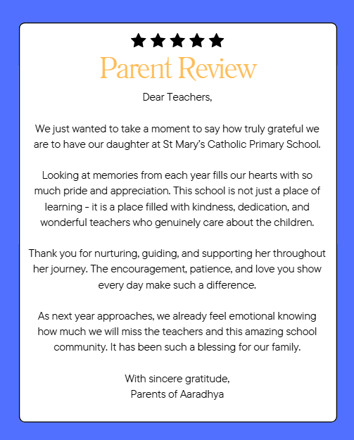 Our vision at St Mary’s Catholic Primary School is to provide the highest quality of education within a Catholic ethos. Through the love of God, we nurture the uniqueness of each child, working hard using the talents God has given us for the good of other people and to achieve our best. Together, with our families, our parish and our local community, we seek to create a safe, happy school where we treat each other with love and compassion and where our children become confident and caring citizens with a passion for learning.